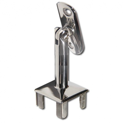 Элемент крепления поручня из нержавеющей трубы диаметром 50,8 мм к стойке изготовленной из профильной трубы 40х40 мм из нержавеющей стали. Модель имеет регулируемый ложемент и отверстия под саморезы в нем. Использование этого элемента позволяет выполнить соединение круглого поручня с квадратной трубой. Цена сопряжения с использованием этого наконечника позволяет сэкономить на устройстве сложного кремпления круглой нержавеющей трубы с трубой квадратного сечения.