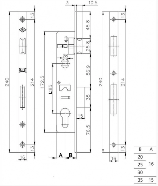 1. Врезной оцинкованный узкопрофильный замок для калитки, KALE (Турция) бэксет 20;