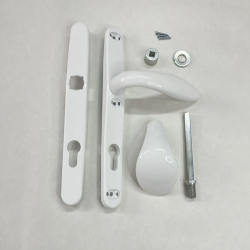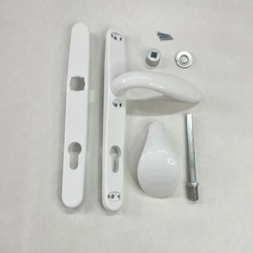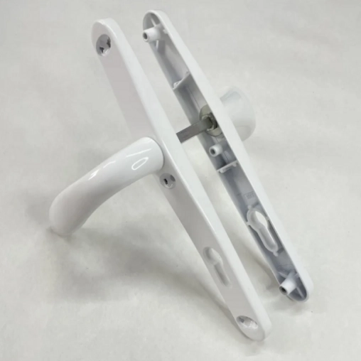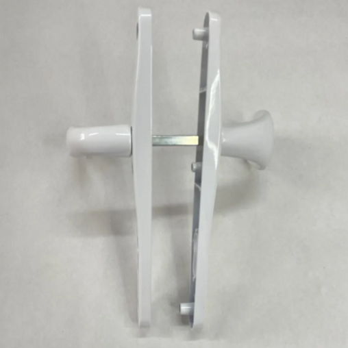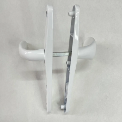Подпружиненные ручки для замка (пара) с комплектом крепежа, цвет ручек - белый. Межосевое расстояние 85мм, ширина планки 30мм.